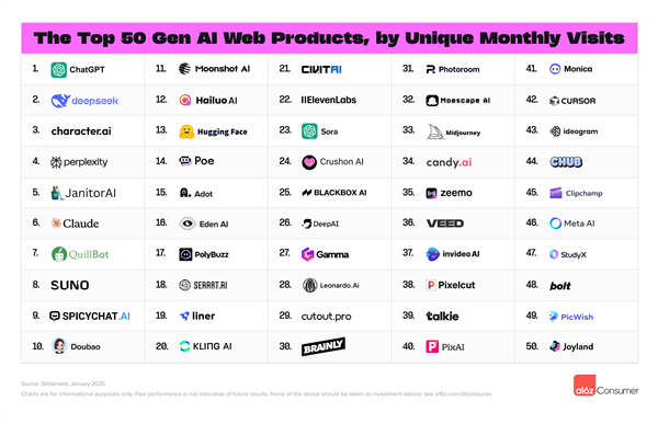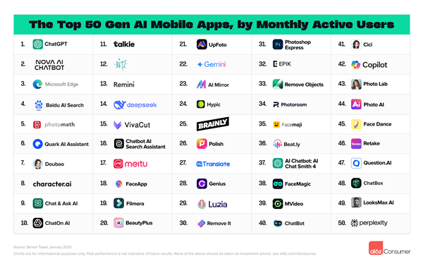 此外按照2025年1月数据,5天内便登上月活跃用户排行榜第14位,基于Sensor Tower月活跃用户评选前50大AI原生挪动使用。不外随后因正在部门国度被禁,海螺视频排名第12,美图排名第17。超越了OpenAI的Sora,仅次于ChatGPT。据领会,全球出名投资基金、征询公司Andreessen Horowitz(a16z)发布了最新的生成式AI消费级使用排行榜。